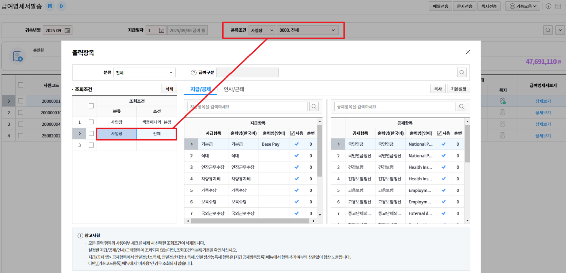 1. 출력항목 > 분류: 사업장, 조건: 전체로 출력항목 설정
