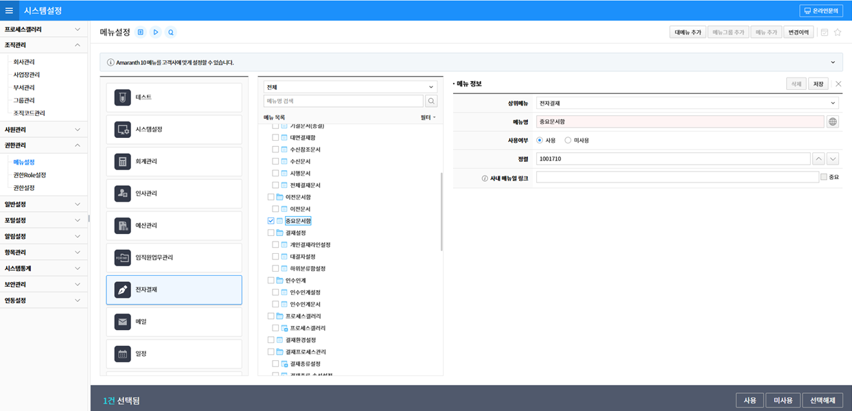 시스템설정 > 권한관리 > 메뉴설정에서 전자결재 모듈 클릭 후 아래 첨부화면과 같이 중요문서함 사용여부 '사용'으로 저장하여 조회해주기 바랍니다.