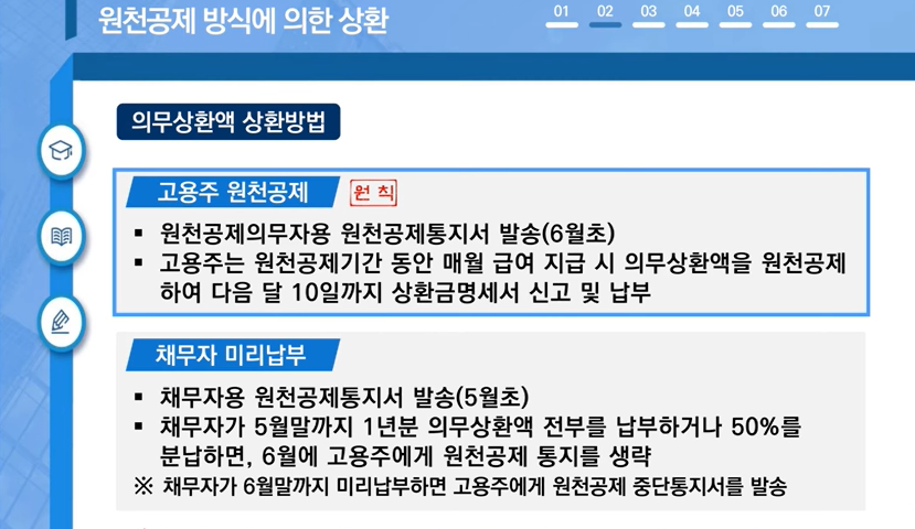 의무상환액 납부 방법은 ①채무자가 사전에 미리 납부하거나 ②국세청으로부터 원천공제 통지를 받은 고용주가 납부하는 방법이 있습니다.